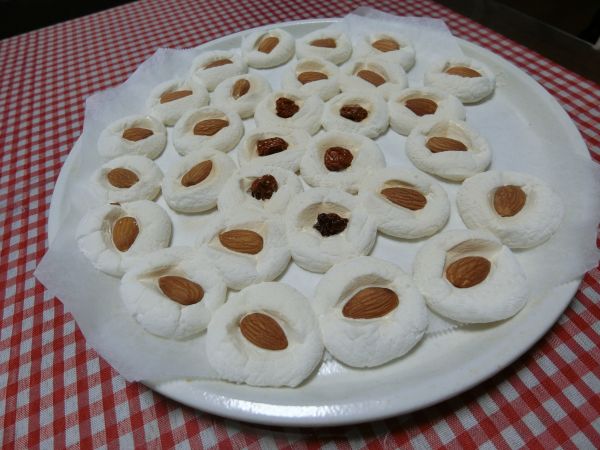 1度取り出して、膨らんだマシュマロの上にアーモンドやドライフルーツをのせる。