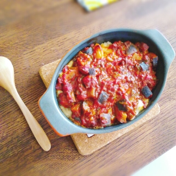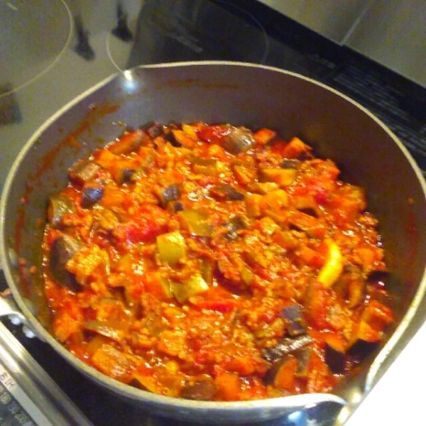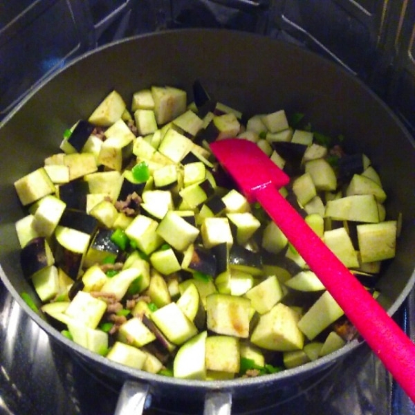 デーツはかなり小さいみじん切り、野菜は大きめの角切りにしておきます。組み合わせはお好みですが、ナスとトマトソースは相性がいいですよ♪セロリもおすすめ。玉ねぎなんかもあいます。