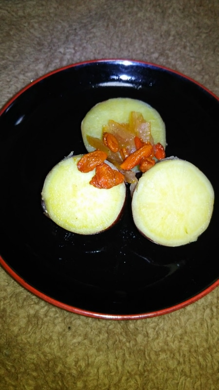 さつま芋を輪切りにし、固ゆで(電子レンジを使っても可)。