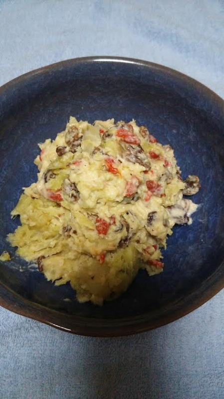 さつまいもと、ヨーグルトに漬けたドライフルーツを混ぜたフルーティなさつまいもサラダ。ヨーグルトに漬けたドライフルーツがやわらかくなり、全体的にしっとり感のあるサラダです。