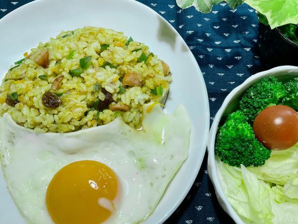 全体に火が通ったら皿に盛りつけ、目玉焼きを添える。好みでベーコンエッグにしてもよい。