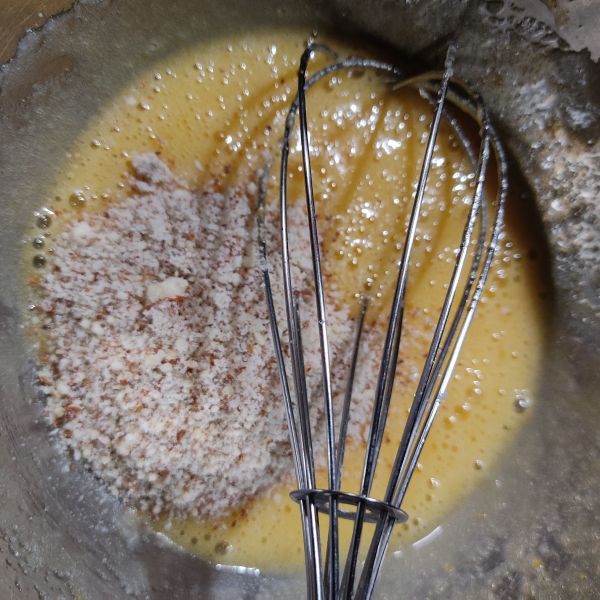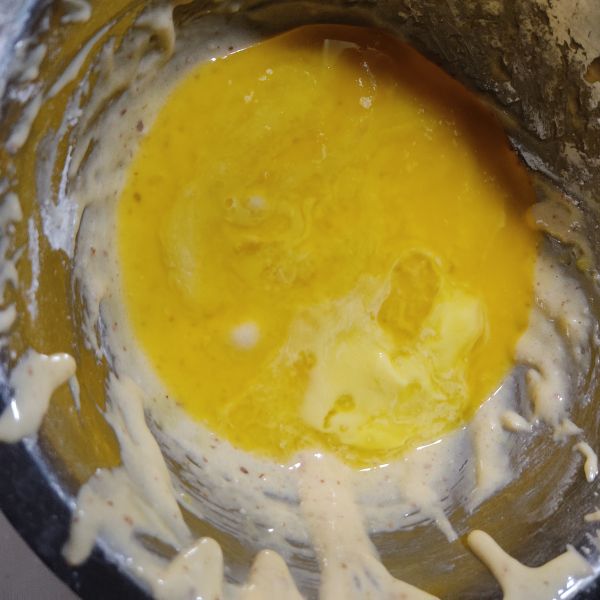 アーモンドは、ミルミキサーで粉状にします。バターはレンジで600w30秒加熱し溶かしておきます。