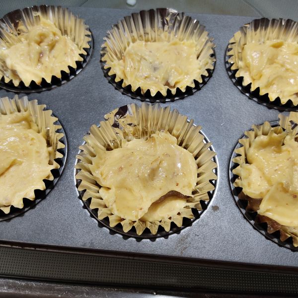 マフィン型にアルミカップをセットし、生地を半分入れてジャムをのせます。