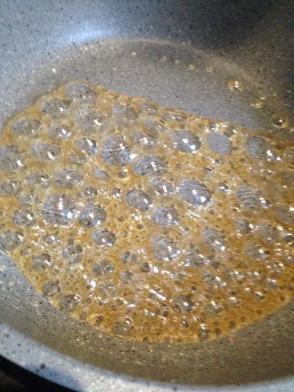 フライパンに砂糖と水を入れ、弱火にかける。
