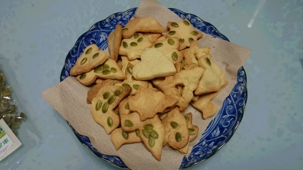 ハロウィンの時のお菓子におすすめ!かぼちゃの種でいろんなデザイン楽しんでくださいね。かぼちゃの種は焼きあがるとサクサクしてとてもおいしいです。BYさや