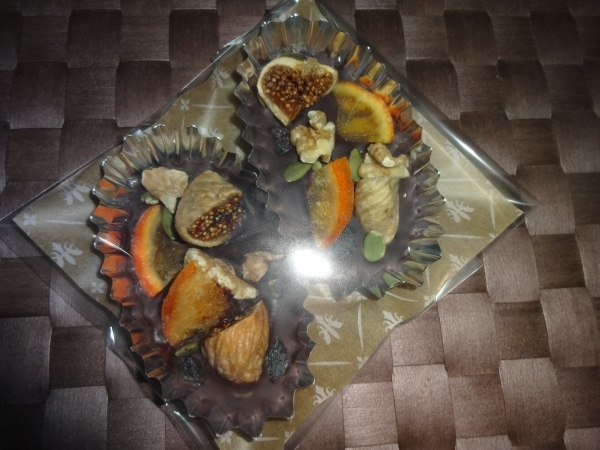 チョコレートが固まらないうちに、1でカットしたナッツとドライフルーツをお好きな量のせる。