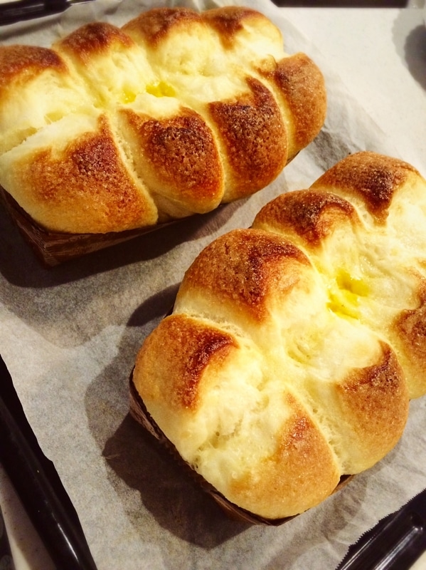 強力粉 100g、薄力粉30g、アーモンドプードル20g、砂糖15g、塩5g、バター15g、牛乳90g、仕上げのグラニュー糖、トップのバター、ドライイースト4g