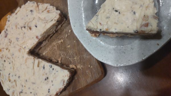 手作りアイスクリームか市販のアイスクリームをボールに入れ、ミックスナッツやドライフルーツなど好きな具材を混ぜたものを3の中に敷き詰めて、2種類めもその上に敷き詰めラップをピッタリして、ラップの上から表面を手で成らし冷凍庫で最低3時間は冷やし固める(表面のアイスクリームが凸凹だとそのまま固まってしまいますので必ず平らにならしてから冷やす)