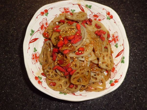 れんこんできんぴらを作り、クコの実を散らします。