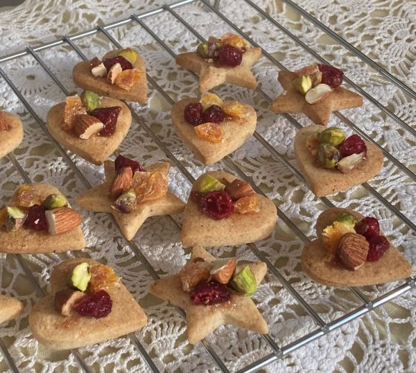 ハートと星の形のサクサクのサブレにナッツやドライフルーツと載せました