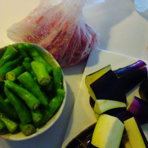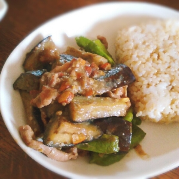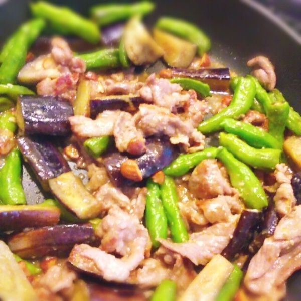 フライパンに多めにごま油を熱してナスを炒めます。全体に油が回ったら、ししとうと豚肉を加えて炒めていきます。