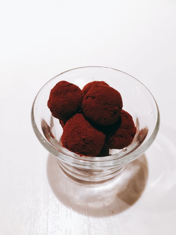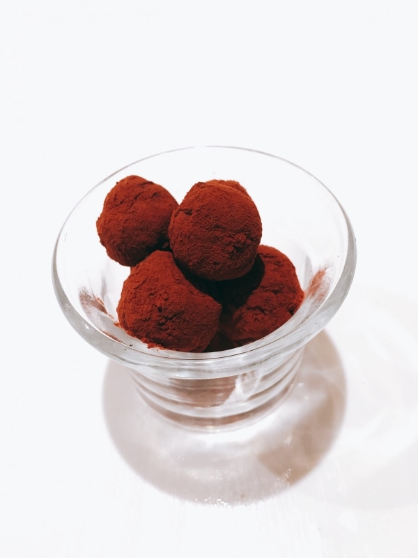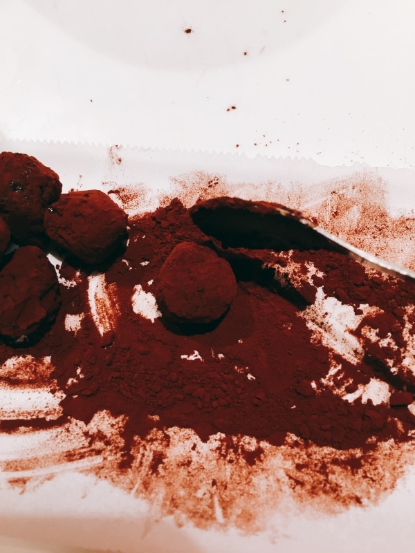 丸めるときにはスプーンを使うと手も汚れずにとても便利です!1度ココアパウダーでコーティングされると、その後はスプーンに生地がつかずに転がりやすくなり、形も作りやすいです!