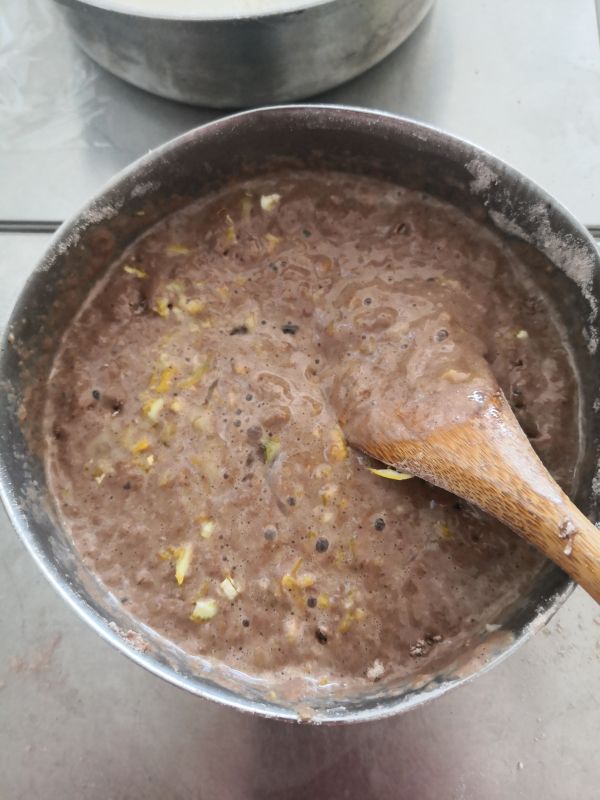 濡れフキンの上でフライパンの底をジュワーと冷ましながら3の生地を流し込む。