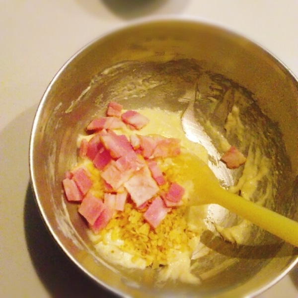 ベーキングパウダーは水分と反応して膨らみます。全部混ぜ合わせたらなるべく早く焼き始めてください。ベーコンはもっとたっぷり入れてもいいですよ^^ アーモンドはダイスタイプを使うと刻む手間が省けます。