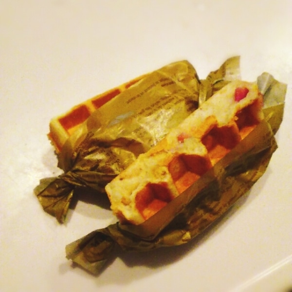 ベーキングパウダーを使うので発行いらず。朝食にもぴったりのベーコン&アーモンド入りワッフルです。食べごたえありますよー!