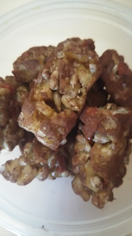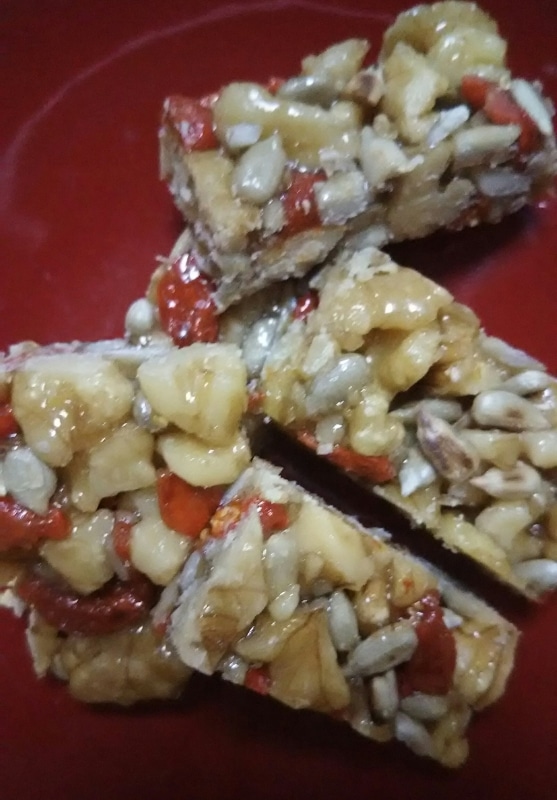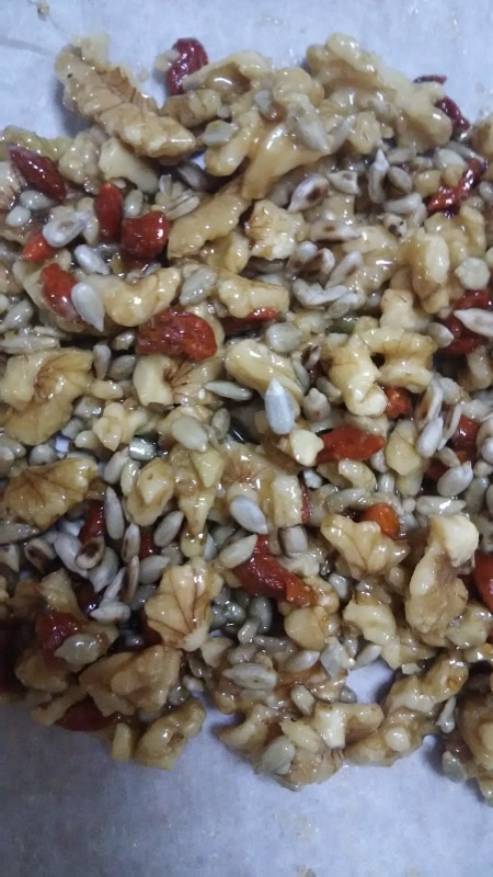 水あめが溶け、大きく泡立ってきたら、くるみ、クコの実、ひまわりの種(10g)を③に入れ、ひとまとまりになったら火からおろす。