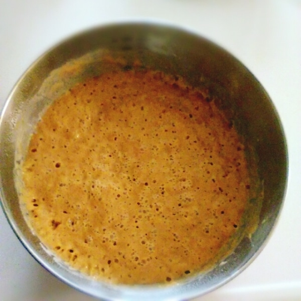 全粒粉薄力粉、強力粉、イースト、塩を混ぜ合わせます。人肌に温めた牛乳と卵を混ぜ合わせて、一気に加えて泡だて器でなめらかになるまで混ぜます。