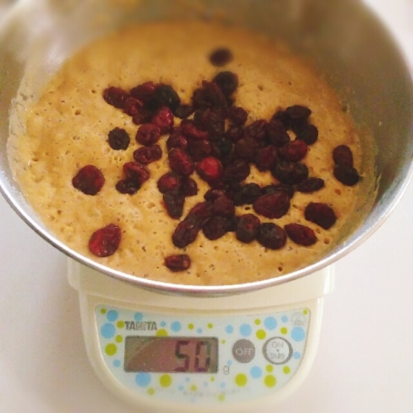 砂糖が控えめな分、クランベリーの甘さが引き立ちます。水分を吸うので、ドライクランベリーもふっくら。倍量入れると、食べごたえのあるおやつになりますよ。