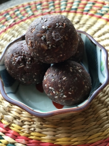 全部がまとまってねちねちした状態になったら、一口サイズに取り、両てのひらを使ってボール状に成型し、好みで細かく砕いたココナッツで飾ります