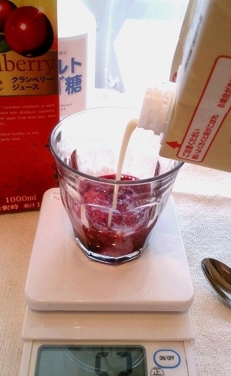 豆乳のたんぱく質とクランベリーの酸が反応してヨーグルトのようになります。