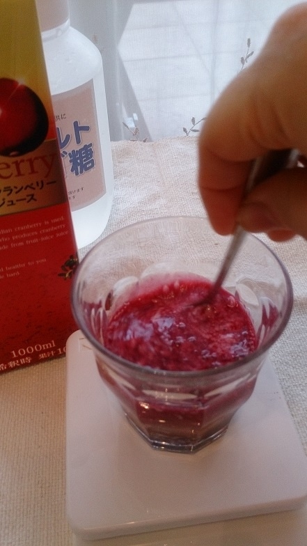 時間を置いておくとゆるくなってしまうことがあるので、召し上がる直前におつくりください。濃いクランベリージュースでしかできないので、フルーティヤのものがおすすめです。きらしてしまった時はレモンでも少し固まります。