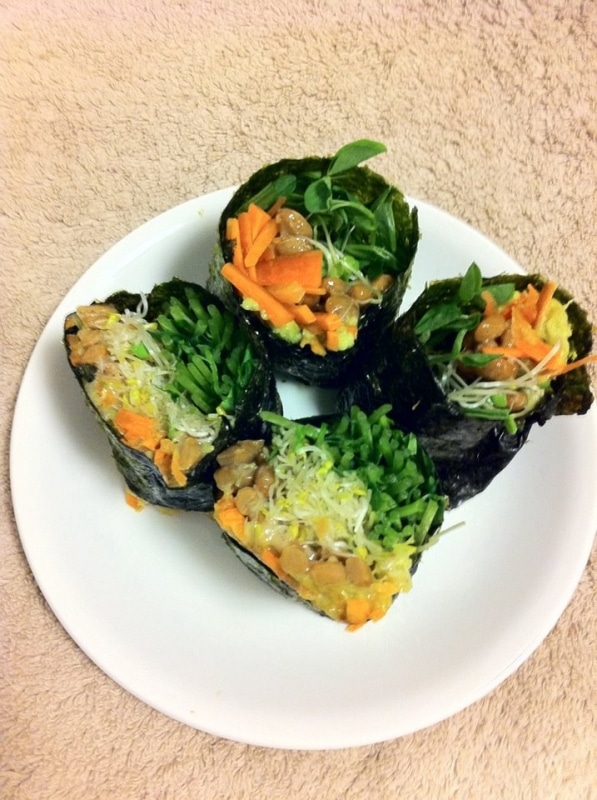 パテの上に刻んだ人参やスプラウト、レタスやきゅうりなど、お好みで野菜をのせてくるくるっと、手巻き寿司のように巻きます。