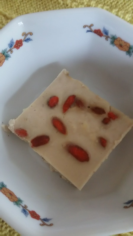 3.に適量のクコの実をのせ、粗熱がとれたら冷蔵庫で冷やし固める。