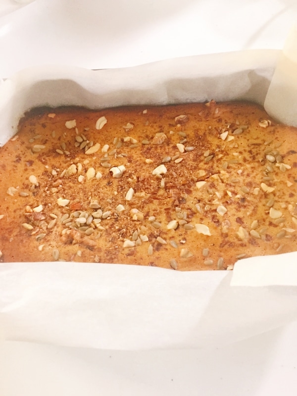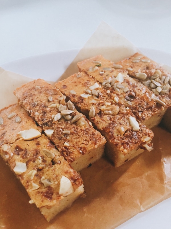 ハワイのおやつ"バターモチ"にナッツとデーツをたっぷり入れました!!!もちもちしていてとても美味しいですよ!!!混ぜて焼くだけです(^。^)
