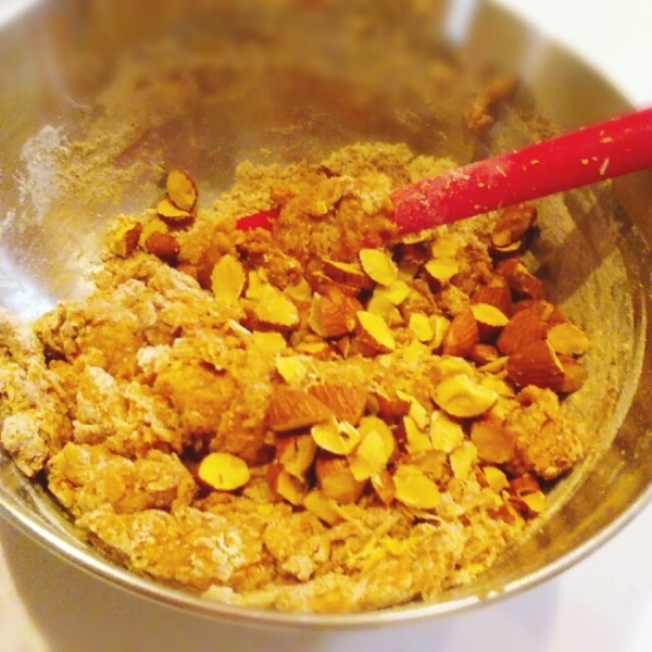 アーモンドはロースト済みのものを使用してください。細かく刻まず、大きめくらいが美味しいです!ベーキングパウダーがたっぷり入っていて膨らむので、工程2は薄いかなくらいでOK。