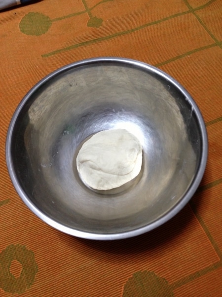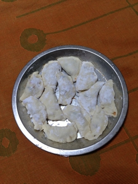 生地を12当分くらいに丸め、粉を打った台の上で綿棒などで、8センチくらいの円形に伸ばす。