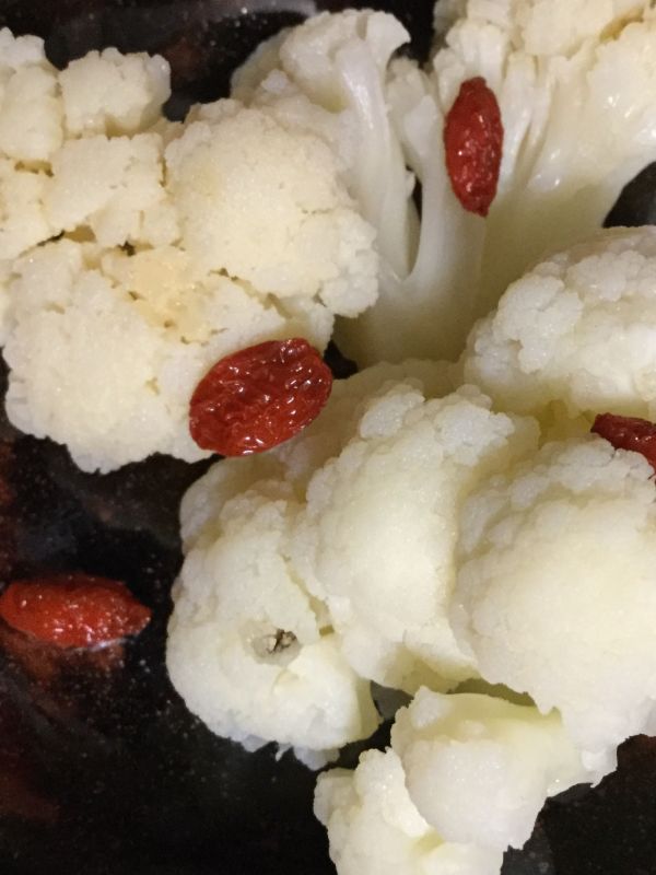 お湯が沸騰したら、1のカリフラワーを入れてフタをし、蒸し茹でにする。最後にクコの実も30秒程蒸し茹でにしてふやかす。