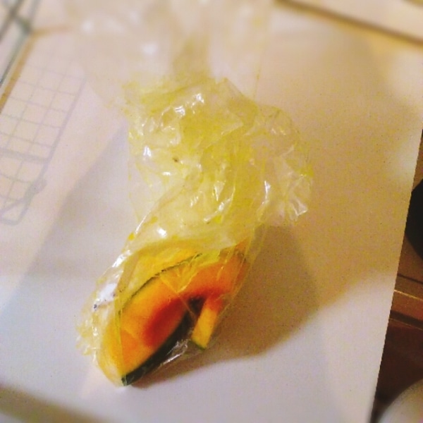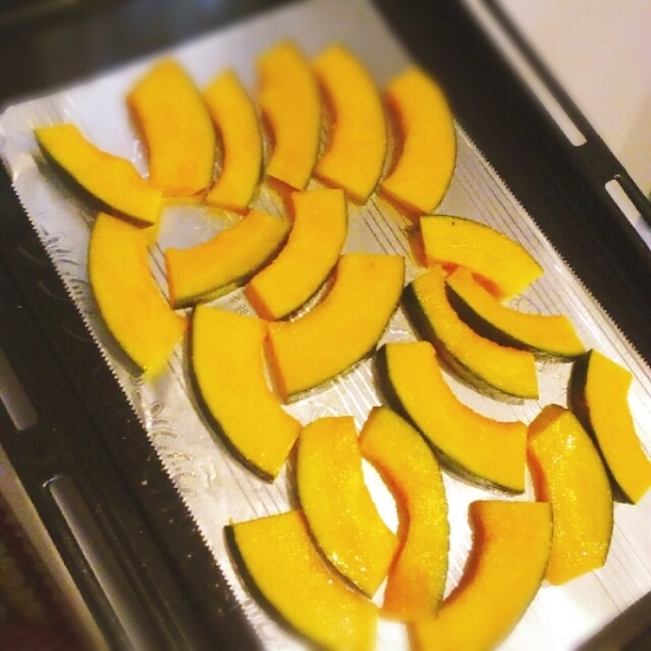 カボチャはワタを取って洗ったら、ラップをかけて、レンジ600wで1分半~2分チン。加熱しておくと切りやすいです。8~1mmの幅にスライスしておきます。