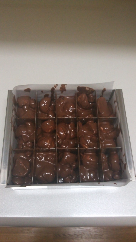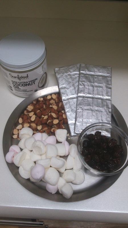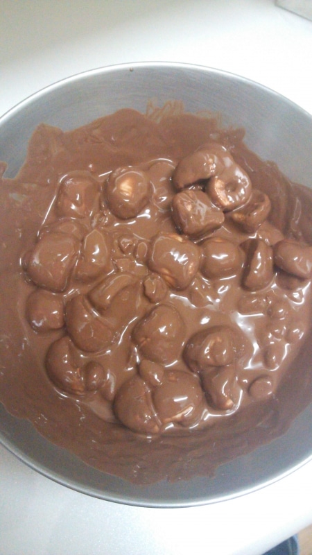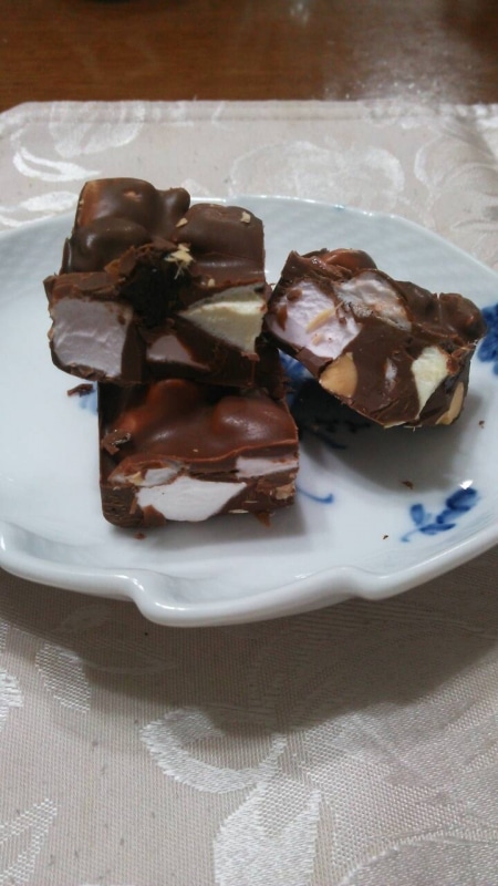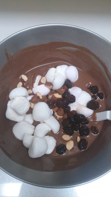 チョコにカリッカリのアーモンドとふんわりマシュマロそしてラムレーズンで大人スイーツに。