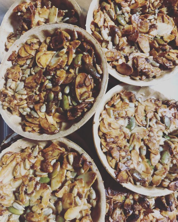 鍋に砂糖、バター、ハチミツ、生クリームを入れ火にかけ茶色く焦げてきたらナッツを一気に入れ、絡めて火を止める