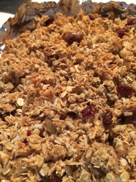 2で予熱完了したオーブンから天板を取り出し、3のグラノーラのタネを平らになるようにのせて、20分焼きます。