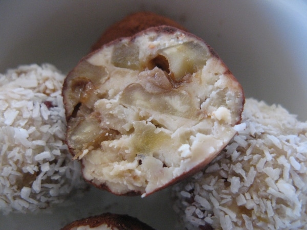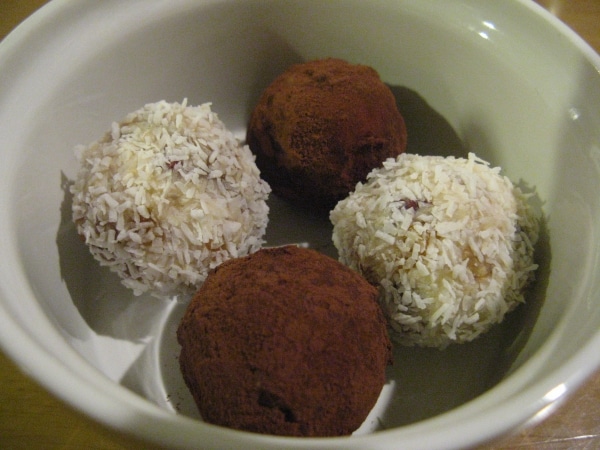3を4等分して丸め、ココナッツファインと純ココアをまぶす。