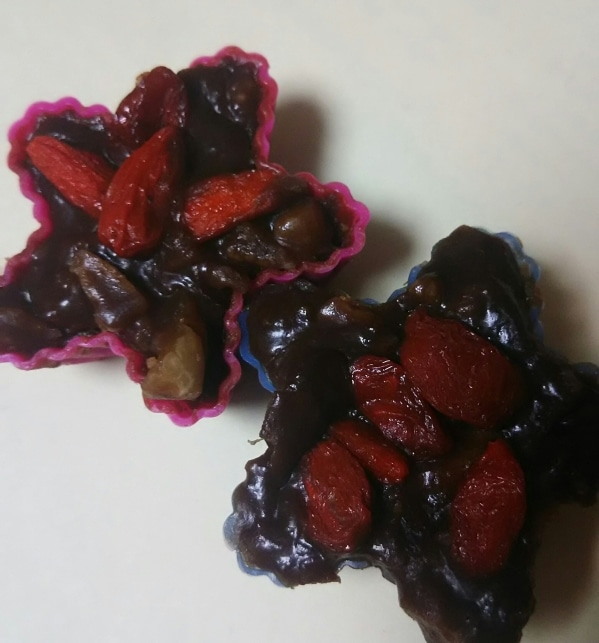 ④をチョコカップに入れ、クコの実を上にのせ、粗熱がとれたら冷蔵庫で冷やし固める。