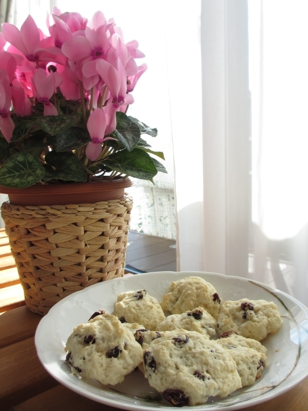 オーブンシートの上に5センチくらいの円形になるようスプーンで生地を落とし、190度に温めておいたオーブンで15分ほど焼く。