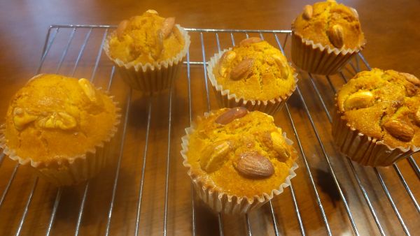 マフィンカップに生地を流し入れ、 ミックスナッツをトッピングし、190度に余熱したオーブンで180度に下げ30分くらい焼いたら完成