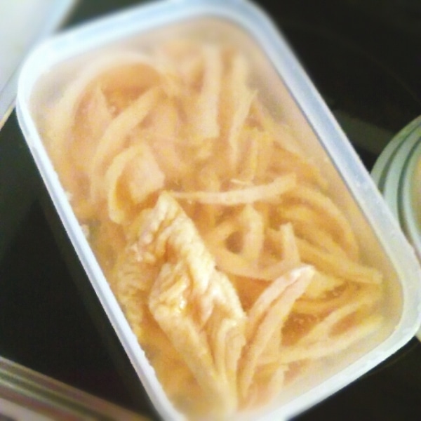 冷めたら鍋の中で一口大に割いていきます。汁の中でさくことで、パサパサになりません!たっぷりできるので、汁ごとタッパに入れて保存。冷凍するときは肉のみジップロックに入れてくださいね。