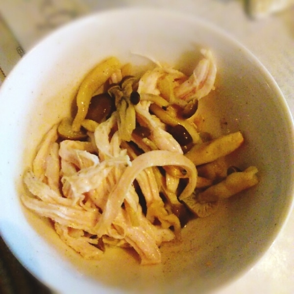 しっとり蒸し鶏の作り方のコツは、予熱で火を通すこと。キノコはレンジ加熱で簡単です。作り置きできるので、夏場に便利ですよ^^
