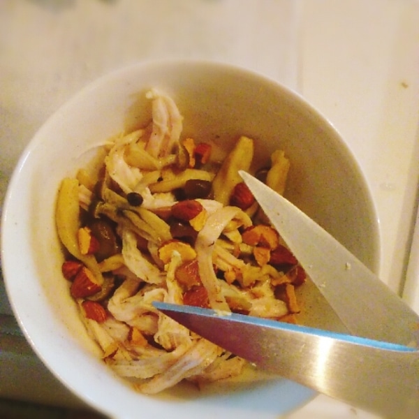 作り置きする段階ではアーモンドを加えないこと。しっとりしてしまって、風味が落ちちゃいます。食べる直前に和えれば、薄味でも味にアクセントがついて美味しいです!カロリーを気にしないのなら、マヨネーズを加えても。